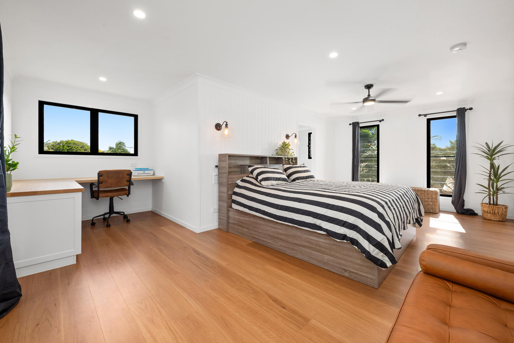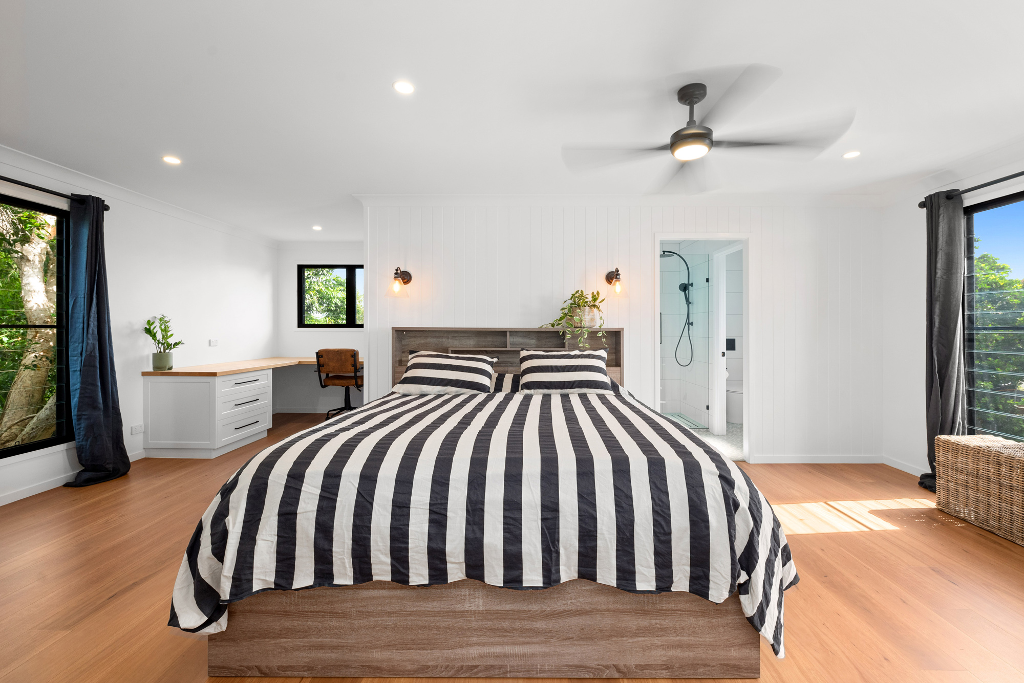 Capturing an all-important Northern aspect, it’s filled with natural light throughout the day and connects beautifully to the outdoors, with bi-fold doors peeling back to extend the main living area to a huge sheltered deck and a lush green backdrop. Akin to its own private studio, the master is one of the four upper-floor bedrooms and offers a stunning hideaway with a walk-in robe, ensuite, and built-in study desk, while downstairs, a huge second living area features a full bathroom and separate entry, with more than enough space to accommodate frequent fly-in guests if desired.