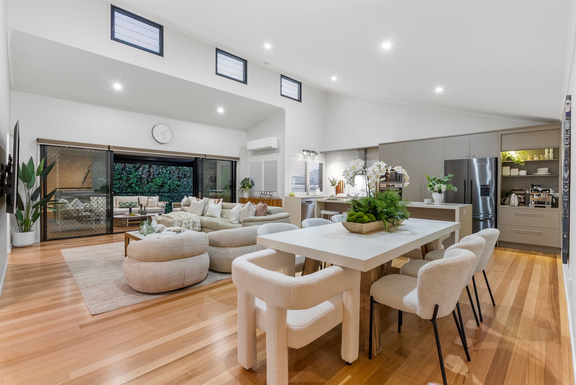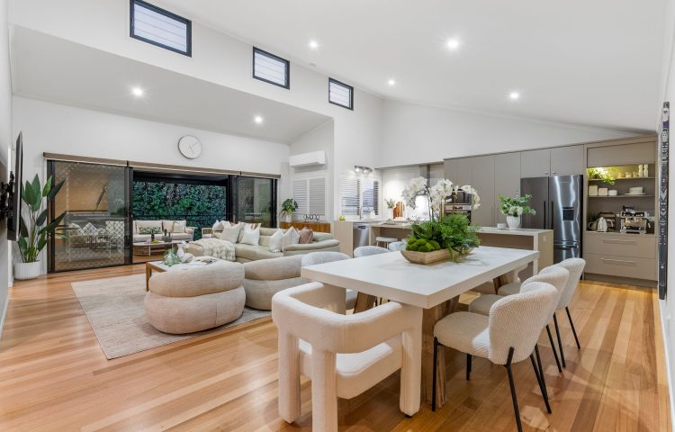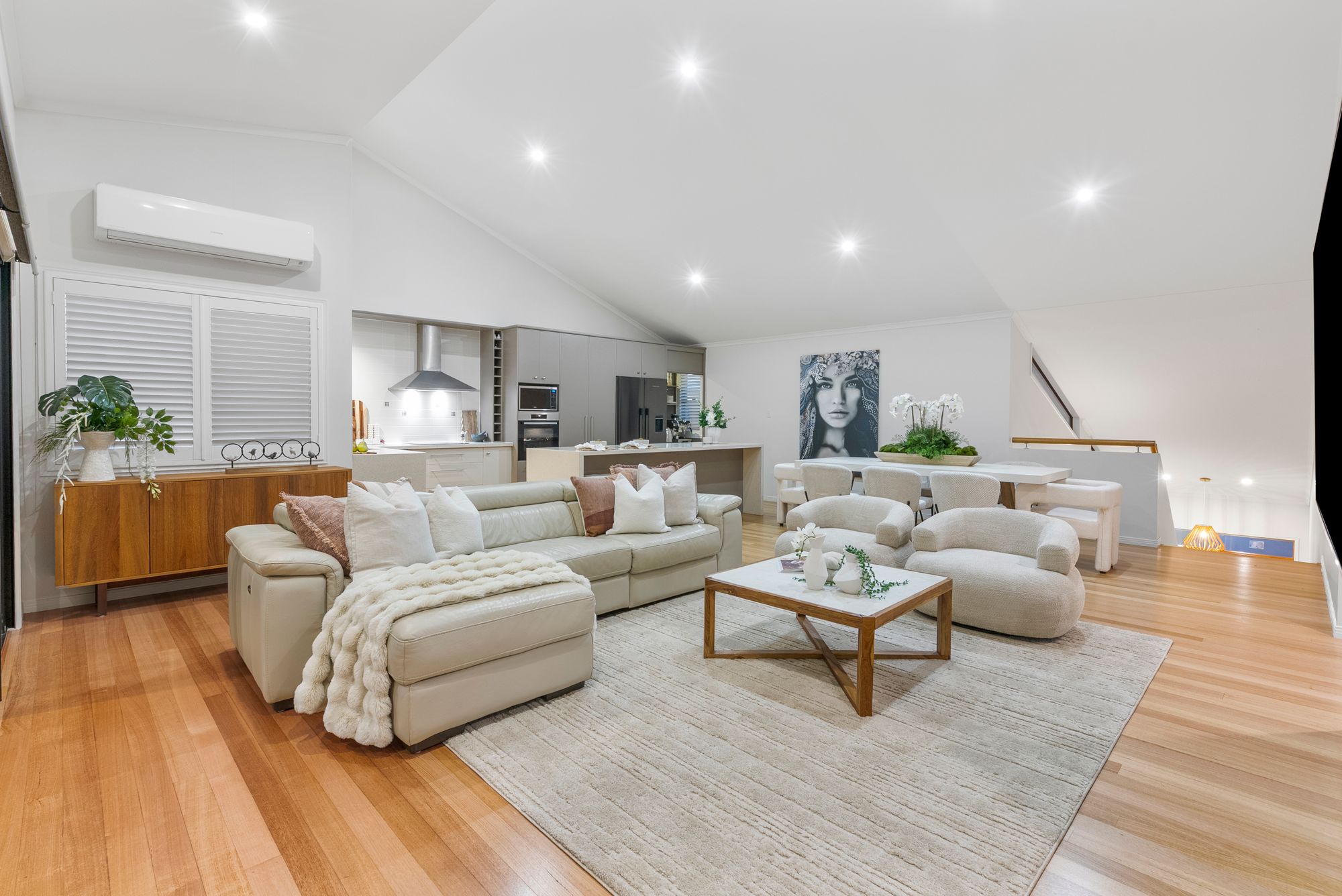 * Spacious open plan family room with dramatic vaulted ceilings and Tasmanian Oak floors