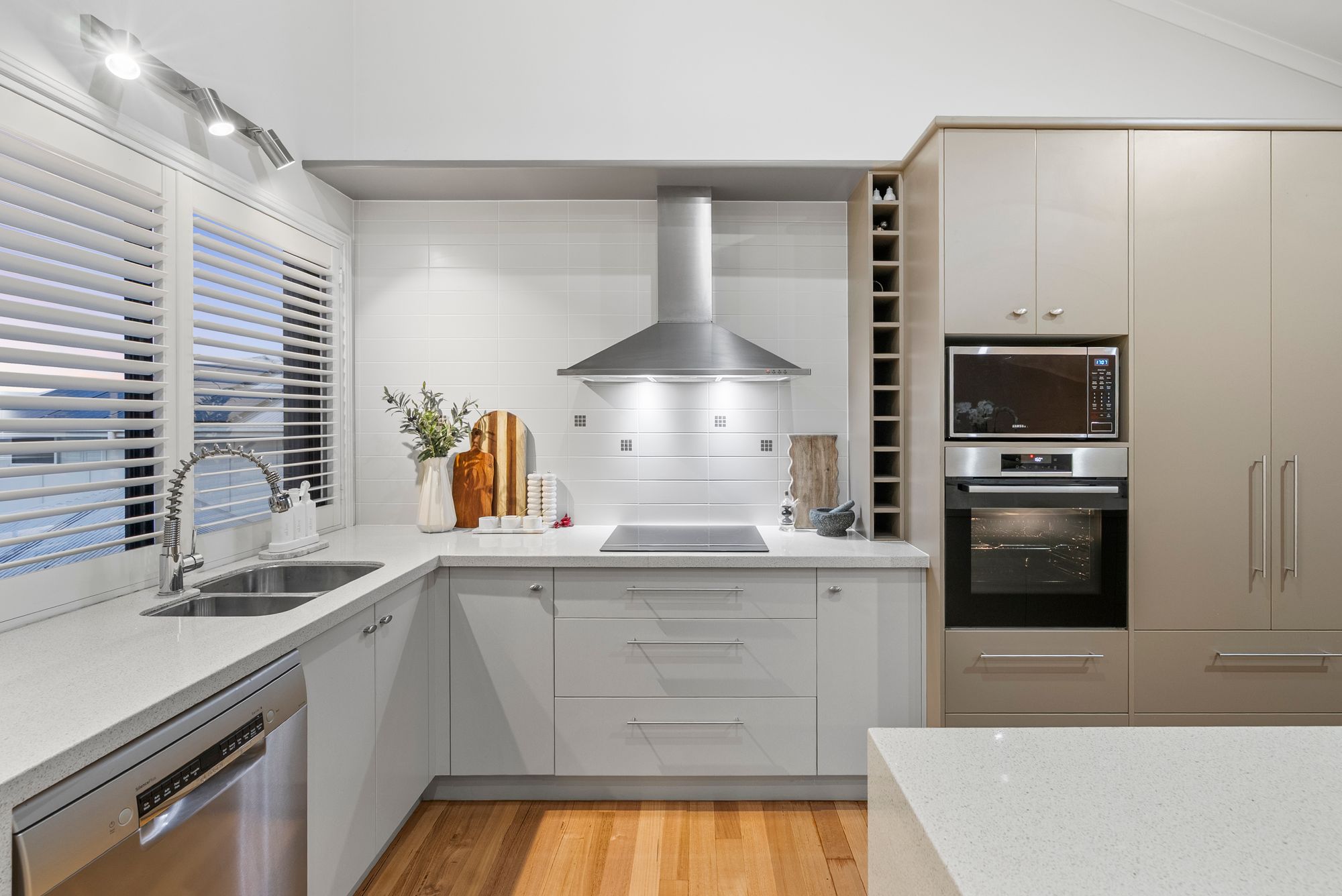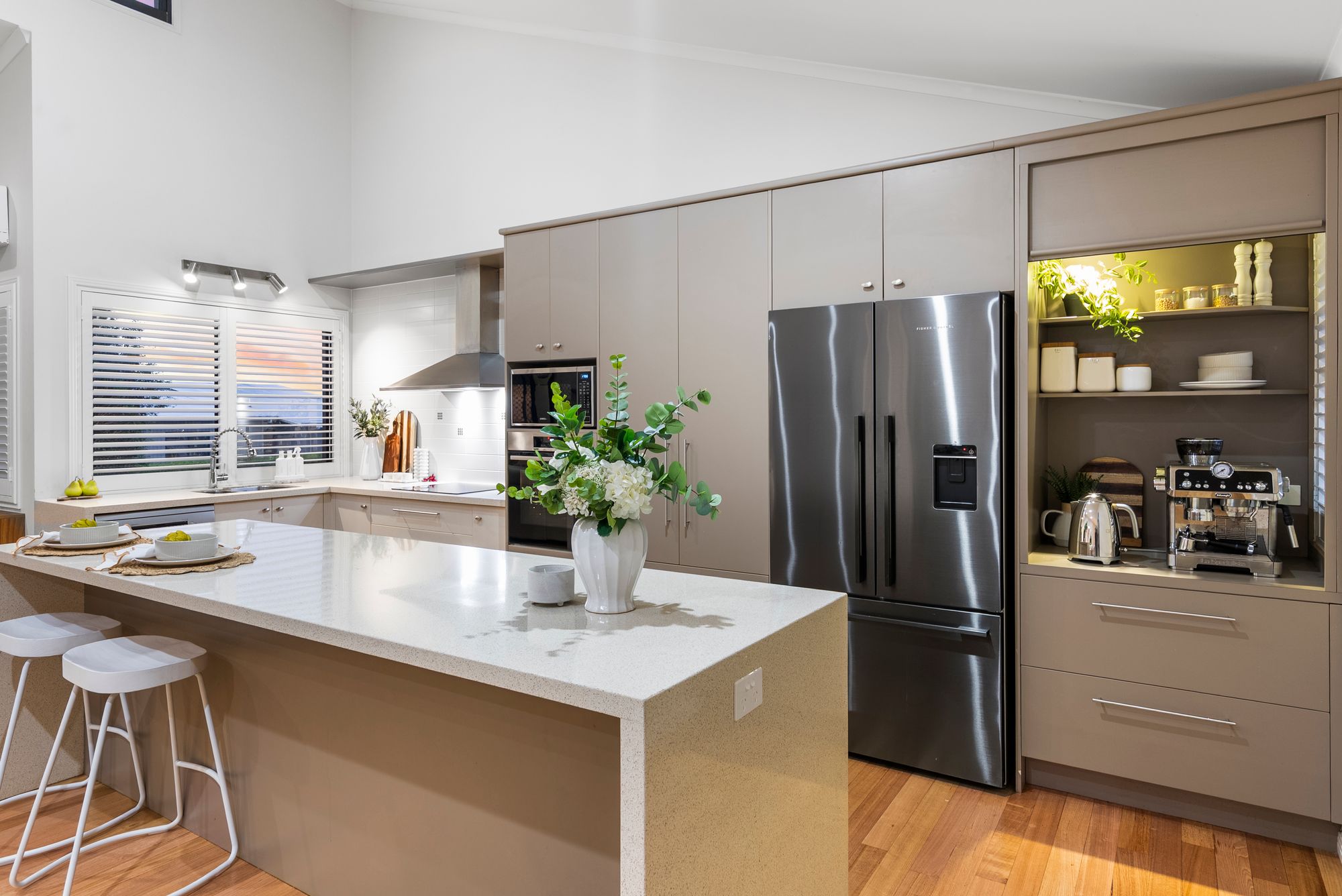 * Chef’s kitchen with stone bench tops and European appliances