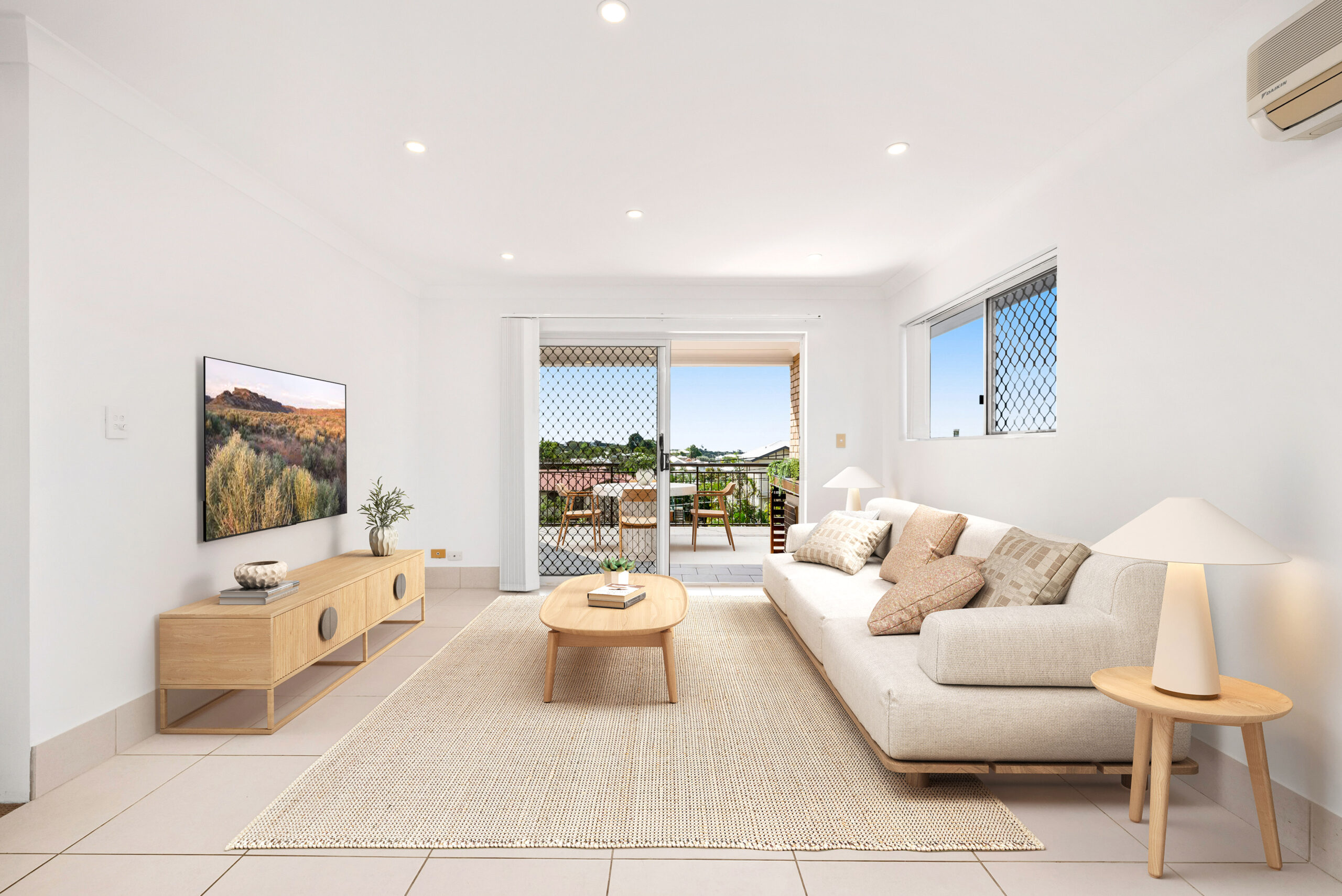 • Split system air con in living, ceiling fans in both bedrooms, and security/insect screen throughout