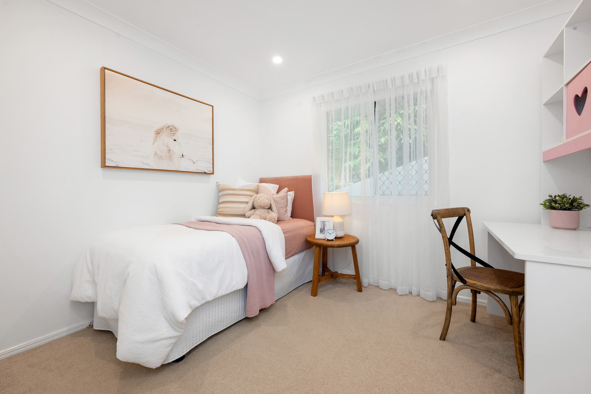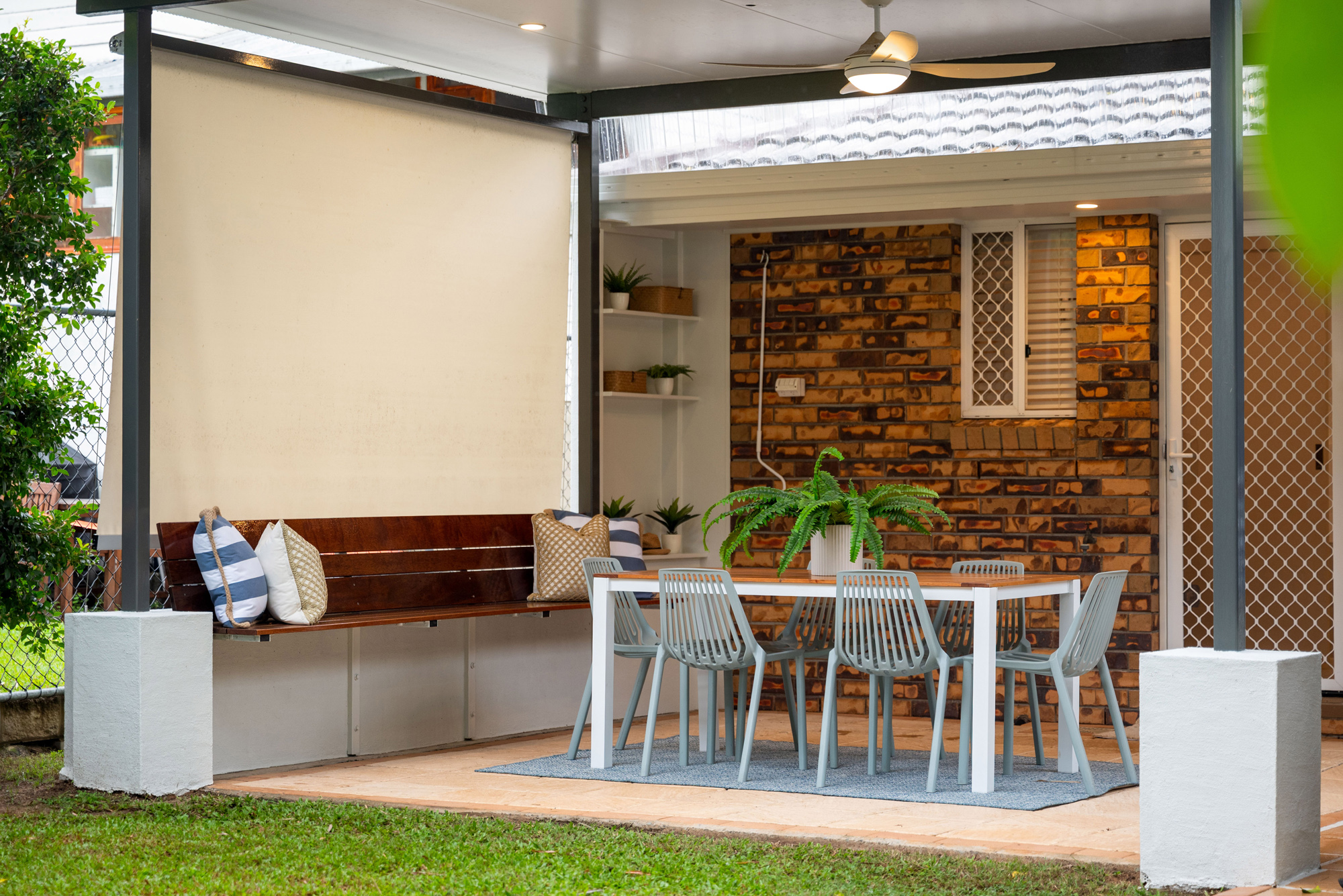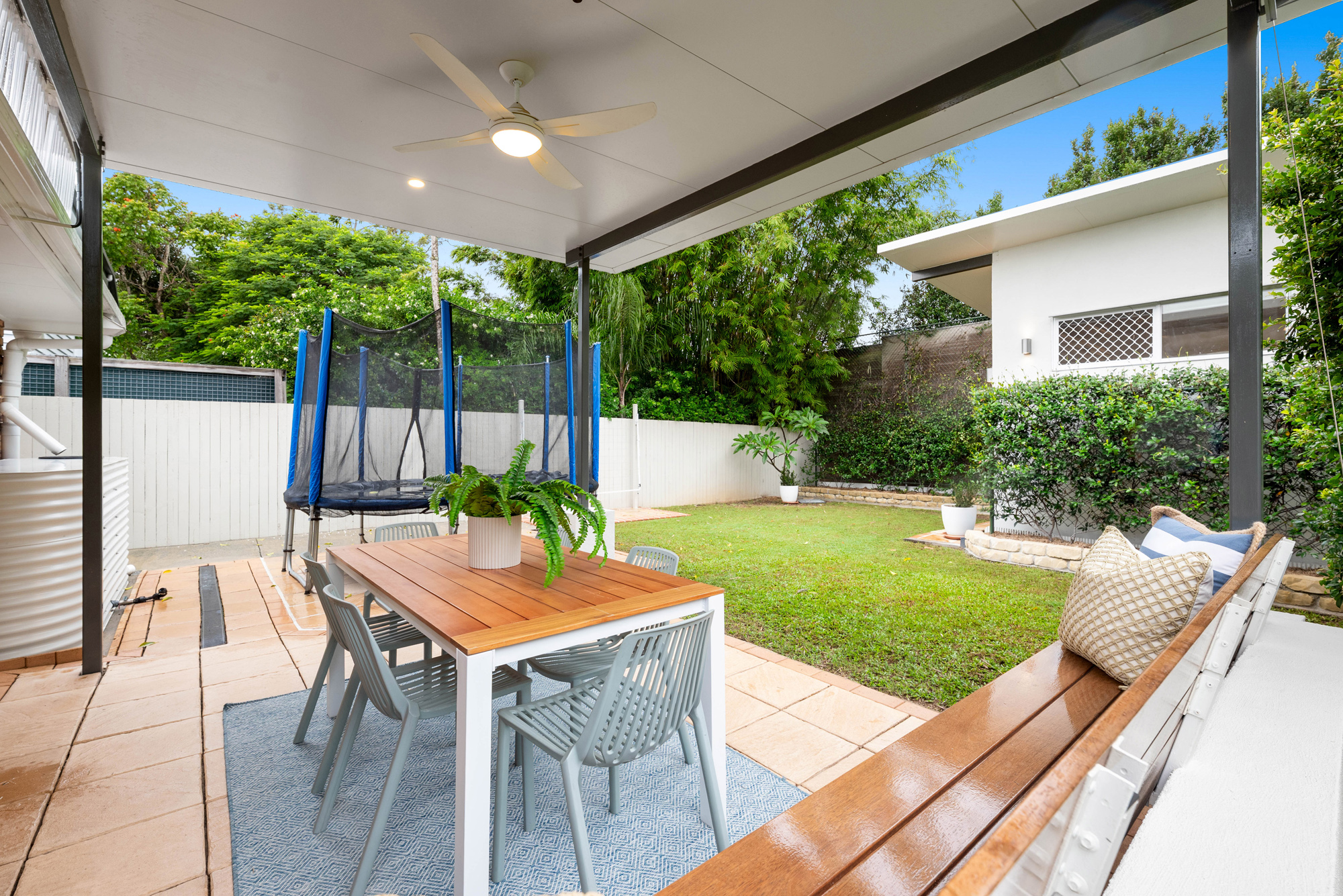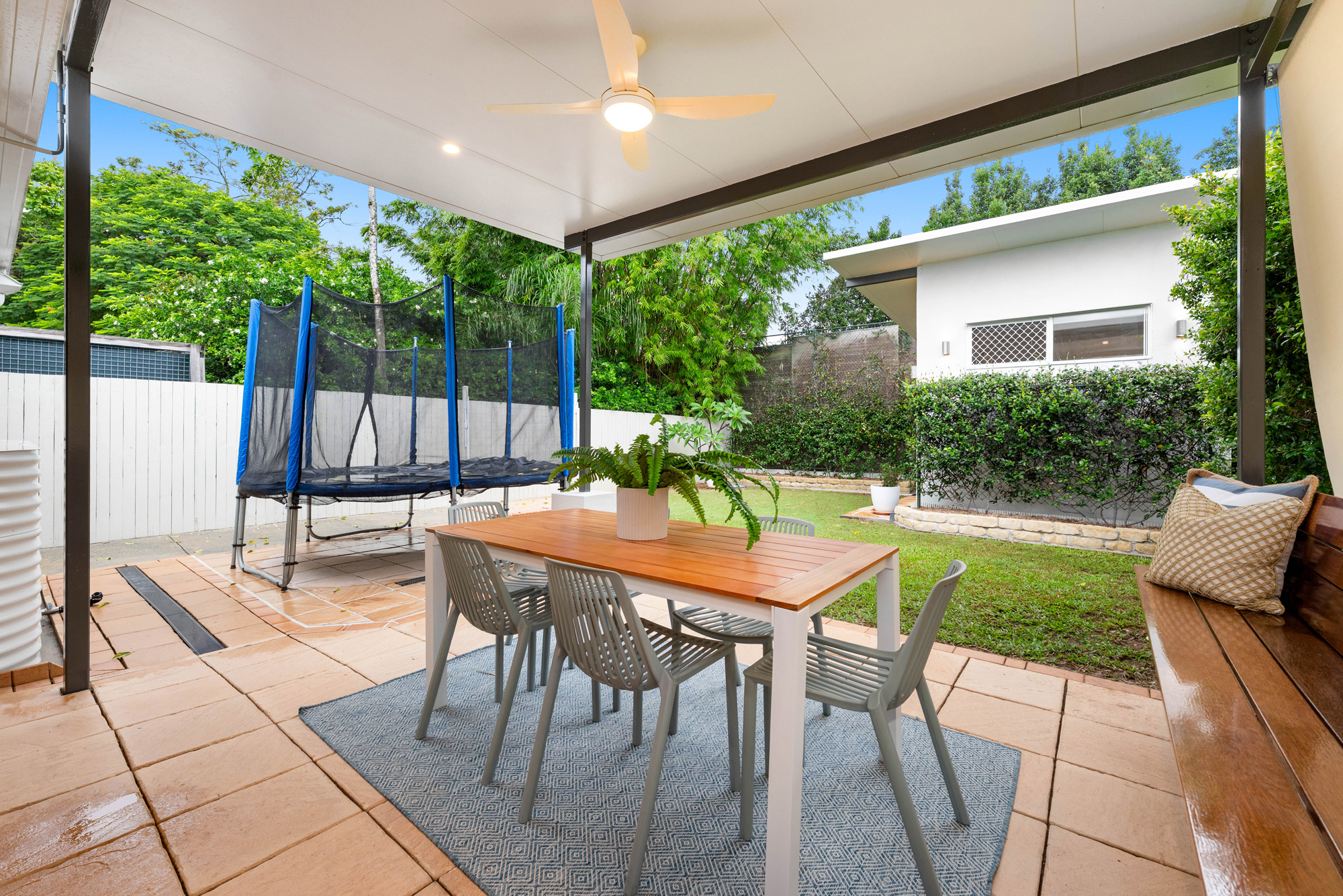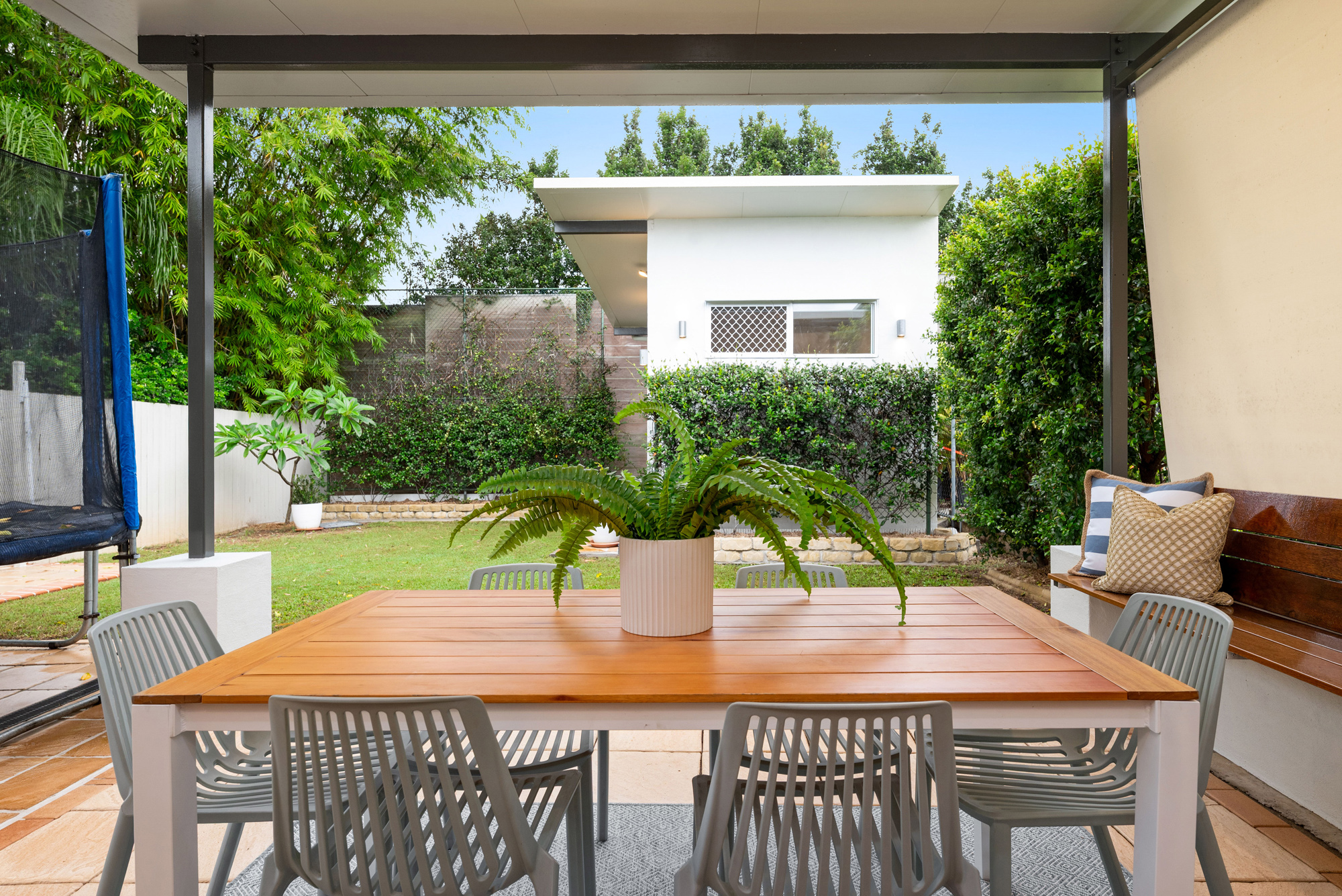 The outdoor area serves up a natural entertainer with a sunny sheltered patio and built-in bench seating; there’s also super-handy gated pedestrian access for when guests or clients arrive, and a rainwater tank to cater to the lush, hedge-framed lawn. A terrific bonus for professionals looking to live and earn under one roof, the detached office offers a sizeable, lock-and-leave space with roller shutters, and while well suited to client-facing roles, it could also easily lend itself to being used as a media room, home gym, or additional bedroom for teens and guests.